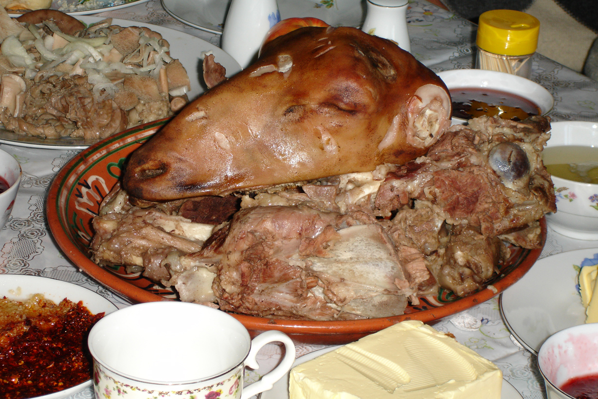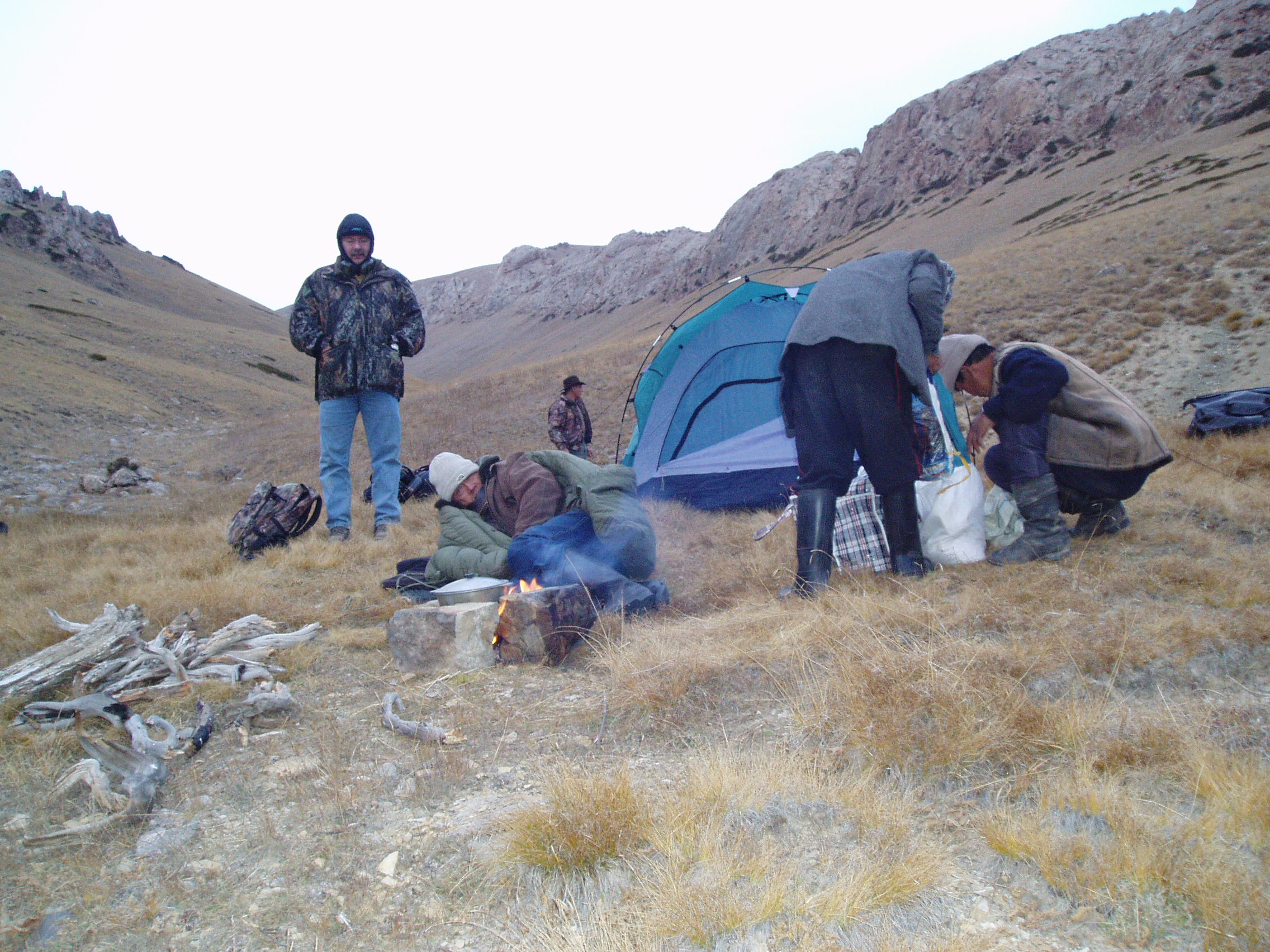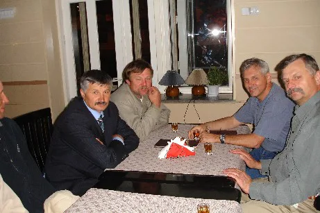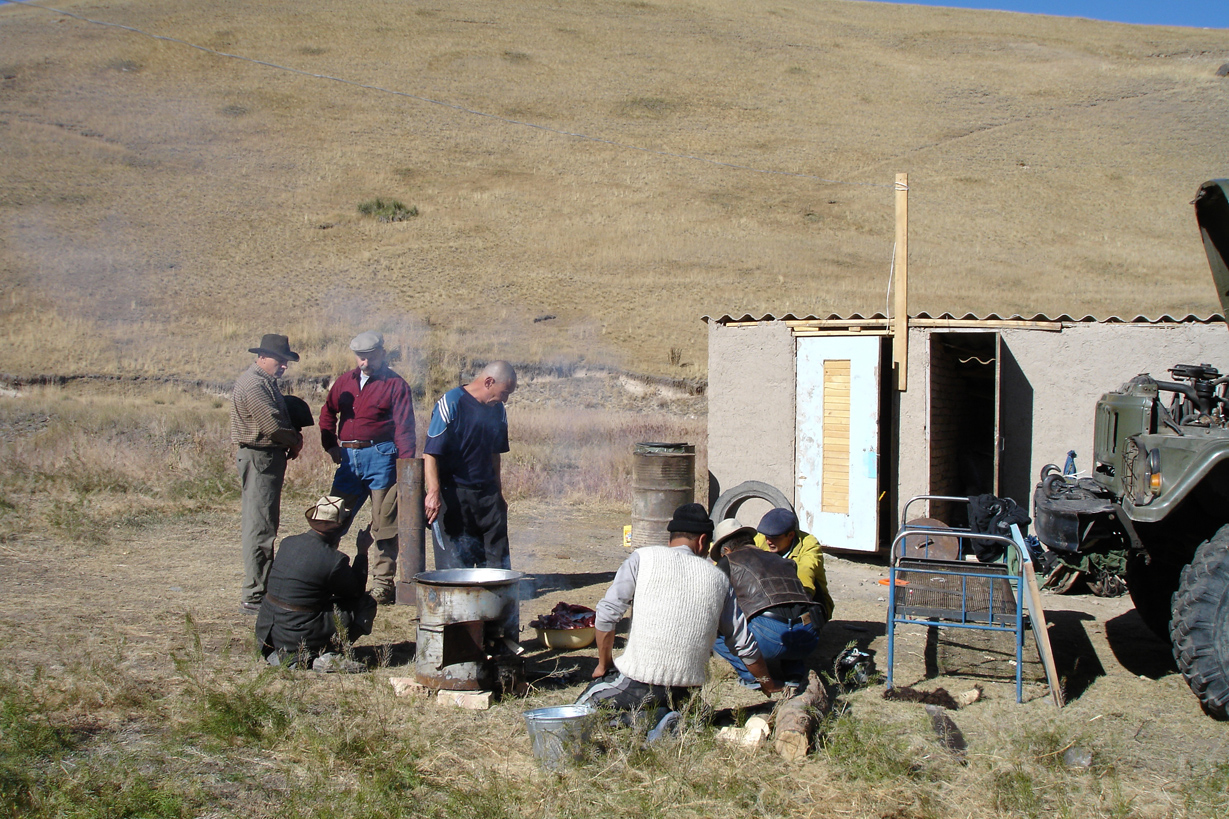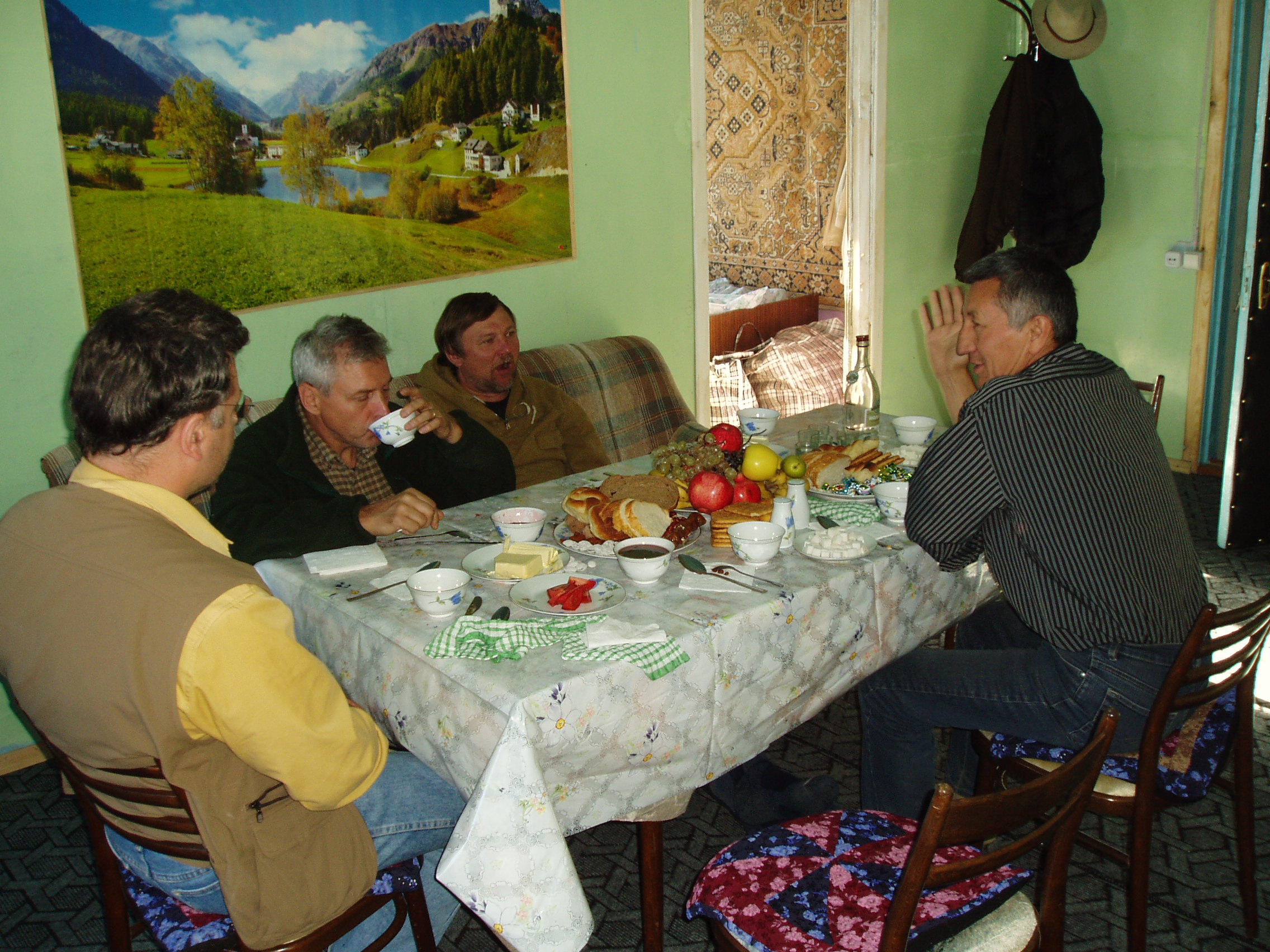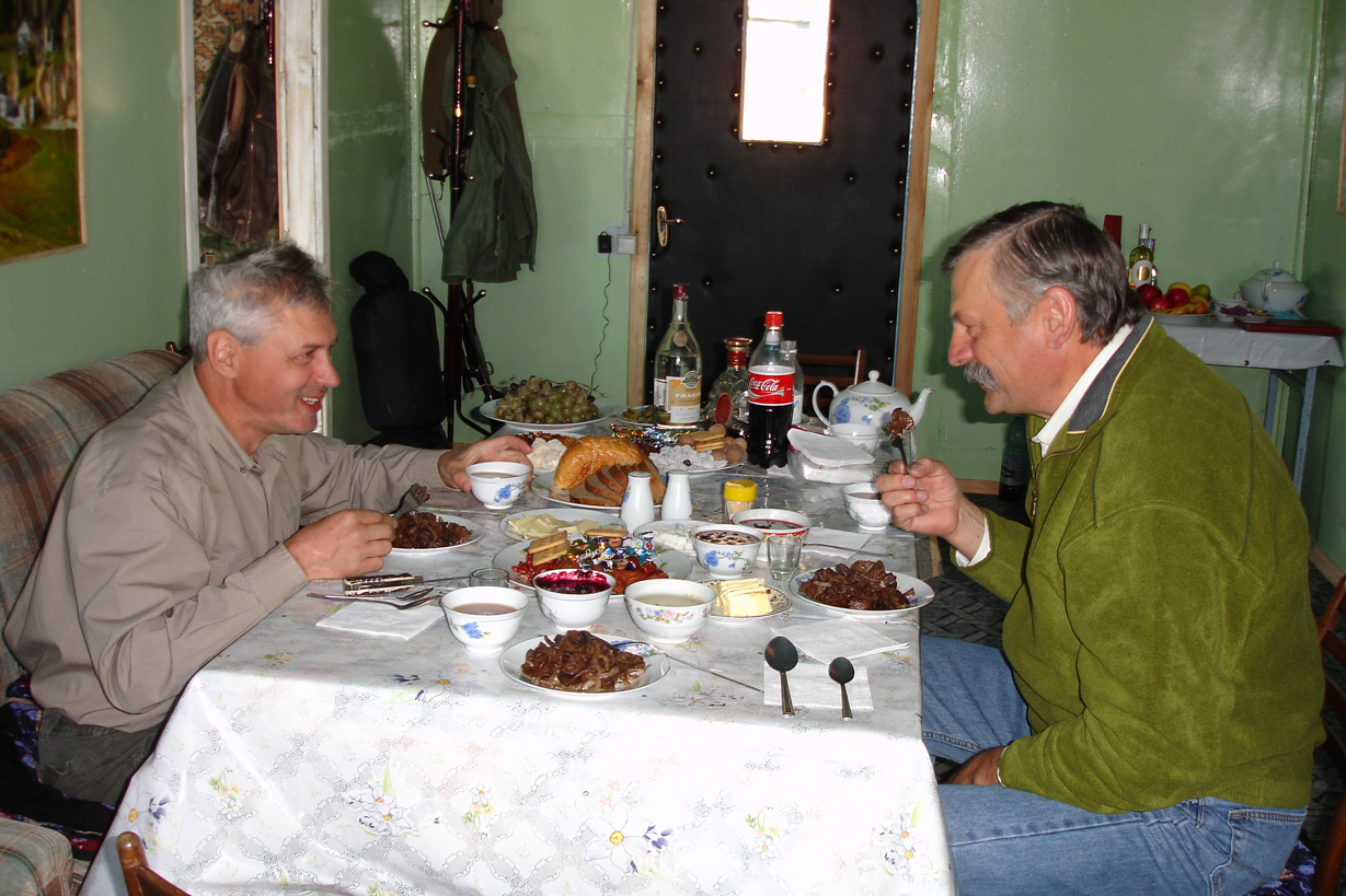Sergei Shushunov and his hunting companions having late night dinner upon arrival to Kyrgyzstan capital Bishkek.